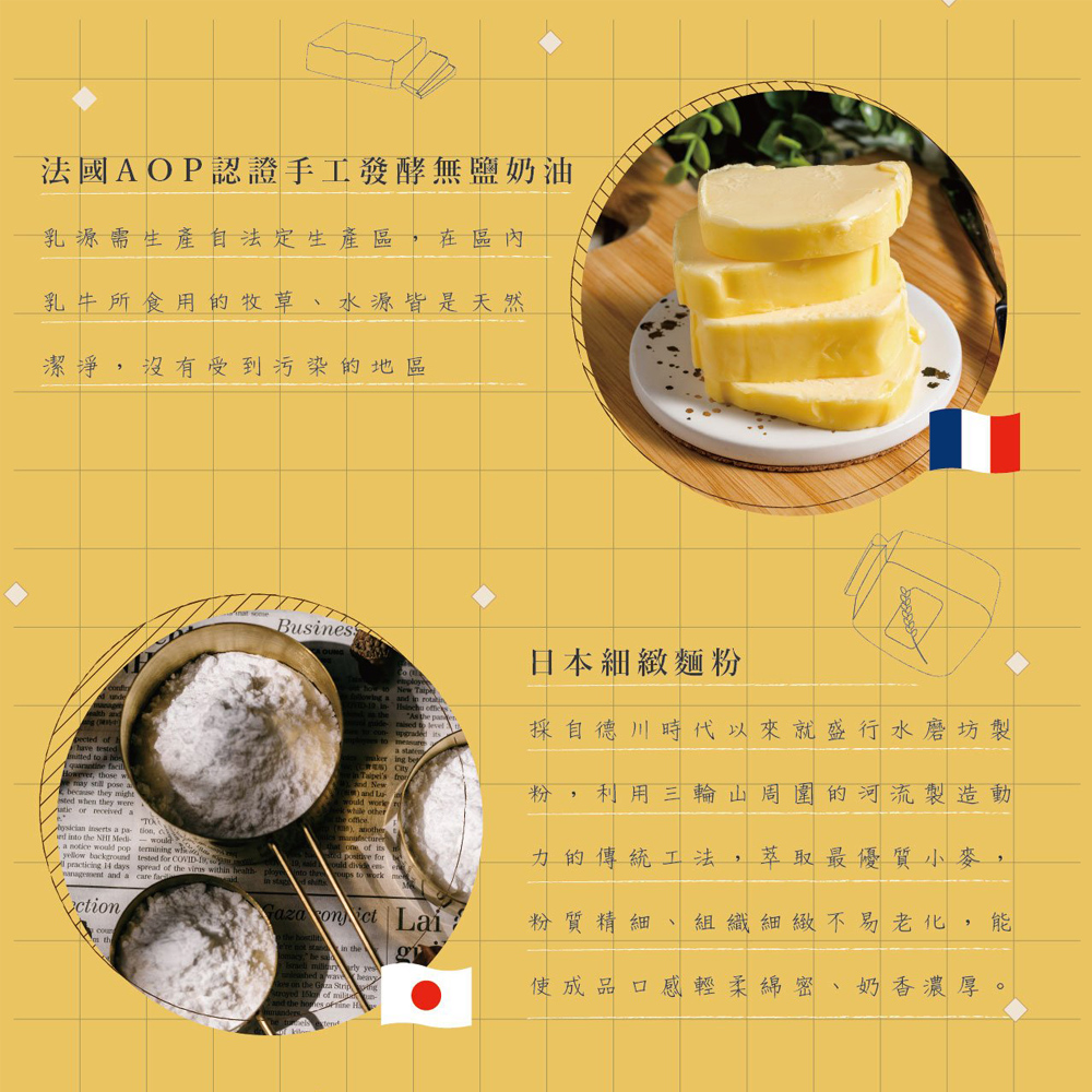 成分:雞蛋、法國奶油、日本細緻麵粉、糖、海鹽(鹽之花)